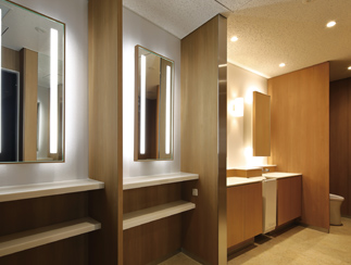 女子トイレには、ゆっくりと身だしなみを整えられるパウダールームを設置。リラックスできる上質な空間を演出しています。