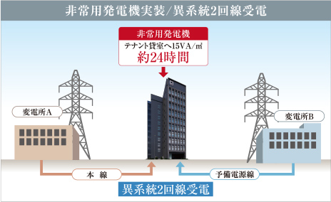 テナント貸室に15VA/㎡相当の電力が供給可能。※2 - ▪️非常時に備えた異系統2回線受電方式