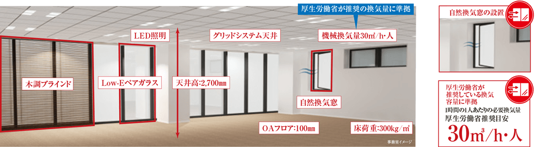 快適なオフィス環境に備えた仕様と機能性。ZEB Ready認証を取得(予定※)し、環境配慮型の最新鋭オフィスを実現。